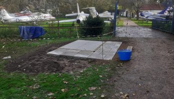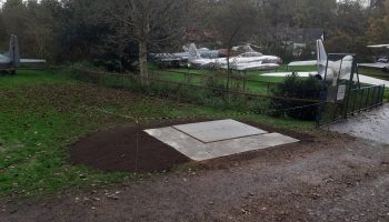 The concrete pad for the new entry “guardroom” (converted potting shed) has now been laid. The shed has been delivered and will (weather permitting) be erected next week.