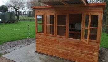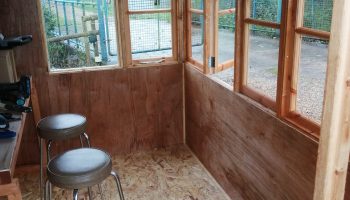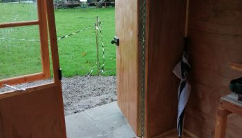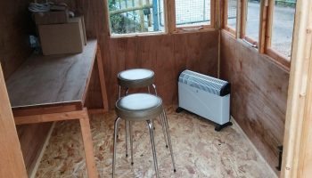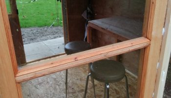 Dave and Michael modified two of the windows at the front of the Visitor Reception. The two below the porch we built last week are now casement windows so people outside can talk more easily to someone inside. They require window catches and locks so we left them temporarily screwed shut until we get the bits later this week. They should be usable for the next opening day.
