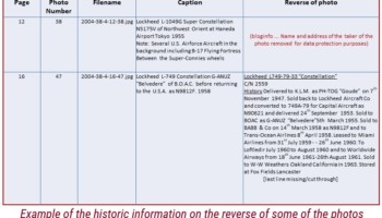 Two examples, of the information content, are shown below in the gallery section. Both are from an album entitled “Constellations”, which contains many photos of the Lockheed Constellation. The reverse of one contains the photographer’s name and address, the other quite a detailed history of the aircraft obviously researched at the time by the owner of the album. The volunteer scanning the photos sent me the following note to explain his slowness at getting through his albums. “I have been slower at scanning my batch of photos because I have been a bit nerdish and only spent a few days on it for various reasons. I have been lifting them from the page where possible and recording the information on the back, as it often does contain the copyright info but plenty more besides including dates! Some are blank, a few very detailed.” An example of the information from his spreadsheet is given alongside the two appropriate photos. I, for one, however, applaud his attention to detail and the fact that this information is being retained for future research and information.