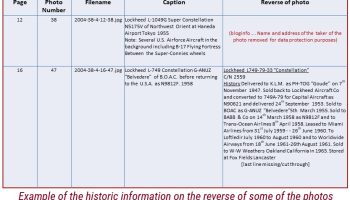 Two examples, of the information content, are shown below in the gallery section. Both are from an album entitled “Constellations”, which contains many photos of the Lockheed Constellation. The reverse of one contains the photographer’s name and address, the other quite a detailed history of the aircraft obviously researched at the time by the owner of the album. The volunteer scanning the photos sent me the following note to explain his slowness at getting through his albums. “I have been slower at scanning my batch of photos because I have been a bit nerdish and only spent a few days on it for various reasons. I have been lifting them from the page where possible and recording the information on the back, as it often does contain the copyright info but plenty more besides including dates! Some are blank, a few very detailed.” An example of the information from his spreadsheet is given alongside the two appropriate photos. I, for one, however, applaud his attention to detail and the fact that this information is being retained for future research and information.