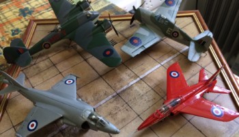 The second, displays 4 x None Luftwaffe Machines which were mixed in a second lot of trays. The Hellcat was complete but was very poorly built so I virtually pulled it apart, rebuilt, repainted plus replacement decals( was originally in USN markings but only had R.N. decals in hand), The Beaufighter just needed cleaning up, the P1127 was an amalgamation of 2 kits, taking the best parts from each to make one ‘new’ one and finally, the Gnat was given new undercarriage doors, nose probe and touch up with paint and varnish.