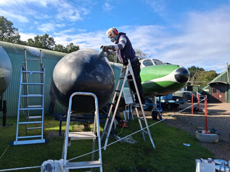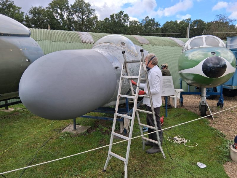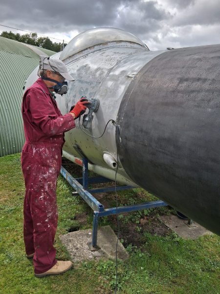 The black nose cone was pretty much ready to go from last week and only needed a quick bit of re-feathering in by Mark (see pic). As the temperature came up the paint tins were opened and Mark and Barry primed the nose cone, assisted by Ian W. who continued the priming back towards the cockpit by one panel’s worth (see pic).