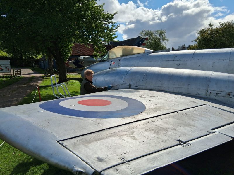 After luncheon, Mark and Ian W. gave the nose cone a coat of Dacrylate Black, while the Skipper (Cliff) continued to prep the ‘canoes’ towards the bottom of the fuselage. As we moved towards close of business, the weather stopped playing nicely and several light showers blew quickly through. In between the showers, there was just enough time though to ‘test’ the Dacrylate Aluminium. The end result can be seen here (see pic). The general consensus was that the Dacrylate was a bit less ‘shiny’ than the Witham’s; which is possibly no bad thing; but needs careful application with a roller in order to get a consistent streak free finish. The manufacturer has also recommended protecting the aluminium finish with a clear lacquer. A job for next week.
