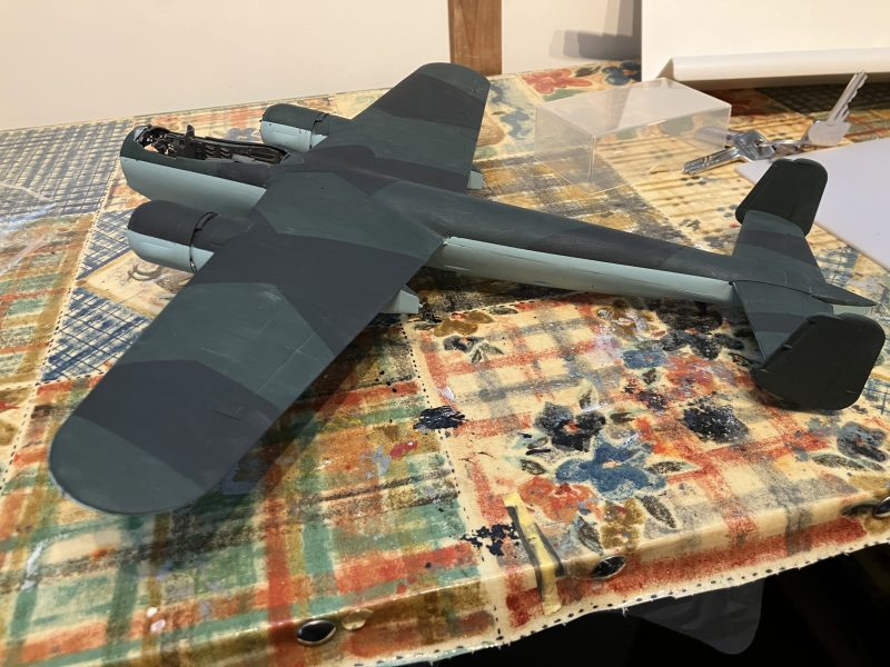 Gary’s Dornier 217E is progressing with the upper green/green camouflage applied, several coats of paint being required. Yesterday, two hours were spent applying a pre-cut cockpit mask to enable the canopies and turrets to receive their paintwork. As the kit is not a recently released item I was pleased that Hannants had a set of Eduard Masks for the model. Without them, it would have taken at least twice as long to prepare.