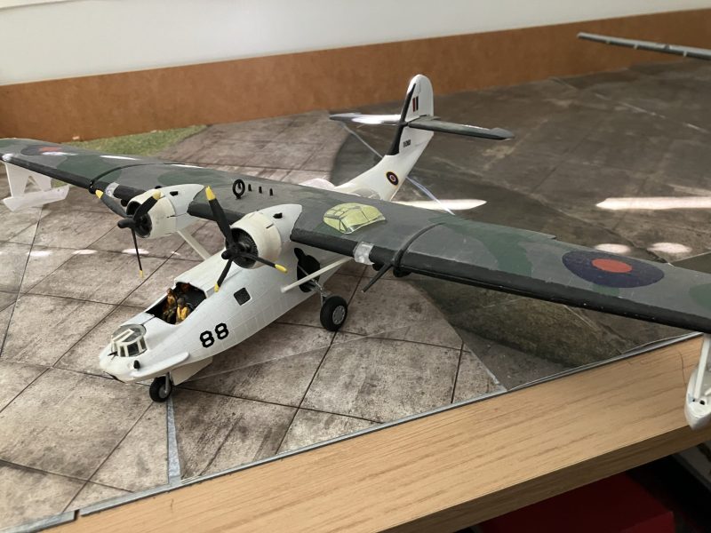 This month’s restoration comes in the form of an Airfix PBY Catalina. I must admit that I have scrapped several of these models due to them being in awful condition. This one was missing several parts and was a tail sitter, but overall, the completion of the model was generally good. First job was to replace the nose wheel and undercarriage doors as they were missing/damaged. Then as much weight as could fit was added to the nose wheel well. This however was still not enough to lift the plane off its tail. I had already considered replacing the canopy as the paint work was poor, so having removed it, further weight was added inside the cockpit. It’s now at a point where no more can be added, and it just about balances on its nose wheel. A ‘new’ canopy was obtained from the spares box, and it has been masked up for painting, which will be completed shortly. Once that is done, it will just need a clean to remove surface dust.