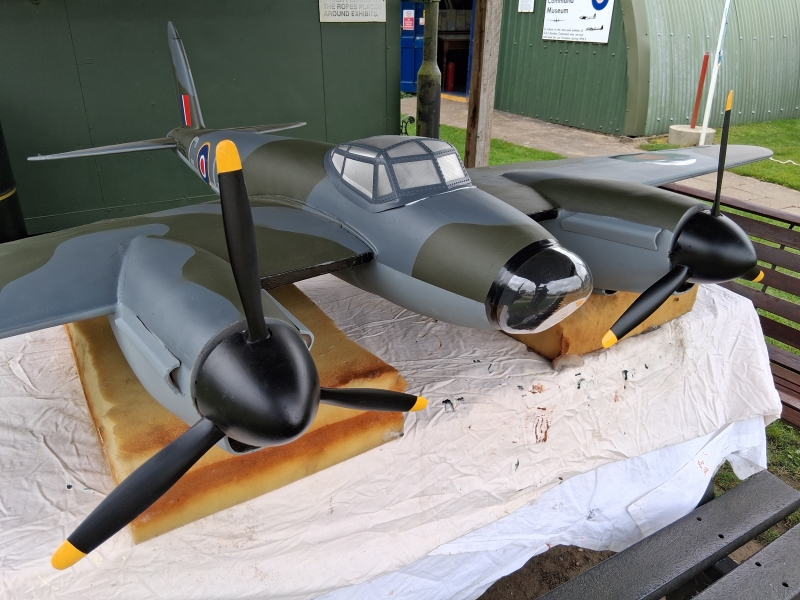 The boys then executed the RTB manoeuvre, bringing the Mozzie model back down to ground level, so that Barry could effect some repairs. Fortunately, since the Mozzie’s initial sortie (i.e. back onto the ceiling of BC), our friends at HJ Plastics had supplied 3 copies of an (improved) vacuum formed nose blister. This was soon installed onto the Mozzie with the help of some electrical tape. The cockpit was then glued, rather than taped, back into place. The Mozzie was then left ready for an air test later in the day (see pic).