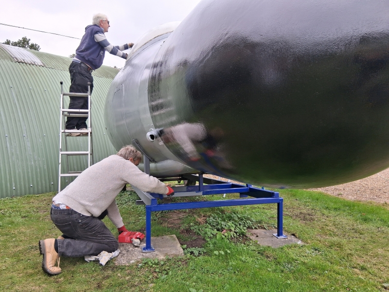 After luncheon, the primer had gone off sufficiently to allow Ian to get on with top coating the frame (see pic), while Mark helped Barry finish off the fuselage. By close of play, Nosey was looking pretty sharp (see pic). A coat of clear lacquer will hopefully be applied next week to protect the ‘silvering’ in the fuselage paint. The markings will then be reinstated over the winter.