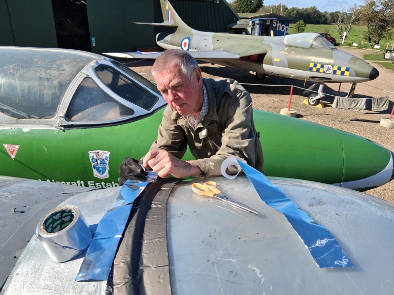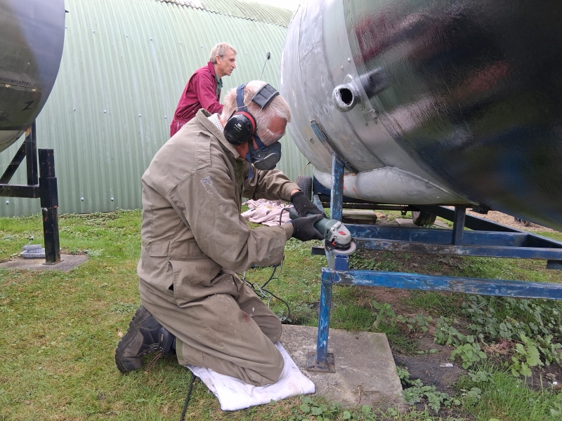 Having completed the necessary repairs, the boys then set about top coating Nosey with Dacrylate Aluminium. By close of play, plus a bit of Fergie time, the boys just managed to complete the top coating of all of the front fuselage (see pic).