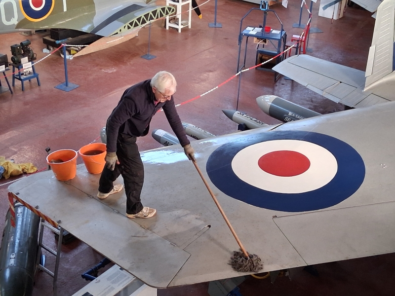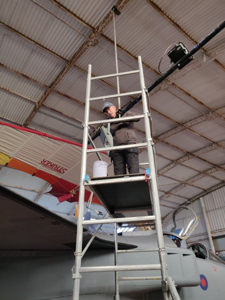 Yes folks, The Doors opened (geddit) this week to some new opportunities. Cross fertilisation took place between the Sparkies and Paint Team as the new collective answered the call to re-position some of the spotlights in the Main Hangar onto the Jag. Some scaff’ was soon rustled up and then your correspondent was sent up the tower to turn a couple of the spotlights that now face onto the Jag (see pic).