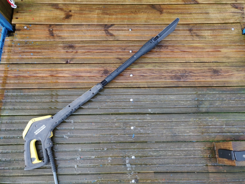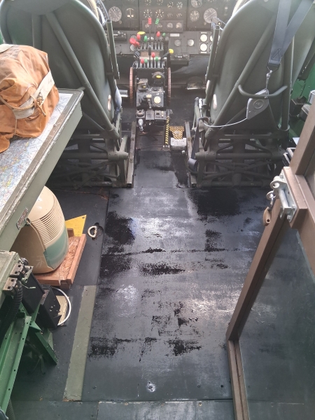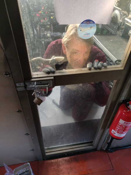 Elsewhere, Ian W. and Mark toddled off to the Valetta to put down a first coat of Matt Black on the recently primed new cockpit floor. Some jolly japes took place, with Ian becoming subject to a temporary ‘lock in’ in the cockpit (see pic). With decorum restored, the cockpit floor was the given a first coat of Matt Black by Ian (see pic). While Ian was painting, Mark pressure washed the ‘decking’ on the steps to the Valetta that were very mossy and consequently very slippery. The transformation was very clear to see (see pic). The next step will be to apply some anti-slip flooring down the centre of the cabin, subject to cost approval.