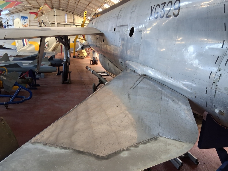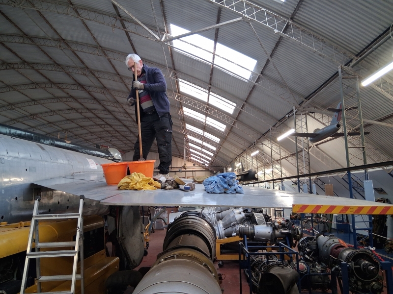 In between other jobs, a bit of time was spent continuing the ‘proof of concept’ clean and polish of selected parts of Lightning XG329. By close of play, Barry had finished the port stabilator (see pic). A few minutes were also taken to figure how best to get up the Lightning’s tailfin next week, to start the ‘top down’ clean and polish proper. A lashed ladder, with a ‘stand-off’ seeming to be the most likely solution.