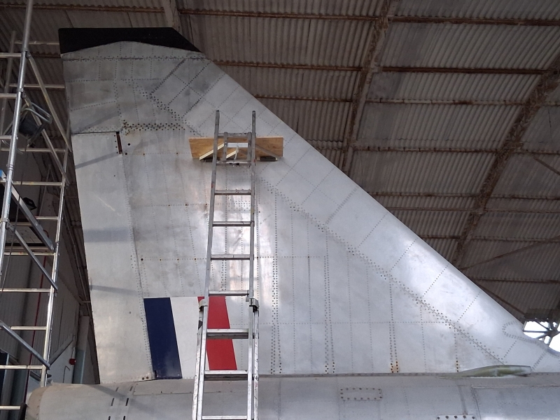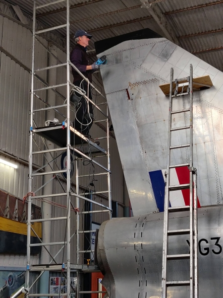 The day kicked off with an assessment of how on earth we were going to be able to get up right to the top of the tail. The boys subsequently toddled off to fetch one of the scaff’ towers, which then got erected behind the tail. Barry then started to polish the top of tail above the rudder with his dual action polisher (see pic). Progress was slow, not helped by the access issues and the weight of the polisher! Results were disappointingly ‘patchy’ at best, for no obvious reason. The surface was very ‘matt’ and the polisher struggled to cut through some of the grime/corrosion with any consistency, especially along the rivet lines.